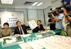 香港商業(yè)罪案調(diào)查科在土瓜灣搗破了一個制造偽鈔工場,7月18日向新聞界展示繳獲的7百多張偽鈔。圖為香港商業(yè)罪案調(diào)查科總警司黃福全講述行動經(jīng)過。中新社記者:洪少葵