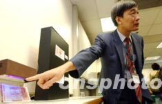 香港商業(yè)罪案調(diào)查科專家余社長,7月18日向新聞界講述偽鈔辨別方法。香港警方7月17日搗破了一個制造偽鈔的工場,檢獲一批面值一百元的偽鈔和制造工具。中新社記者:洪少葵