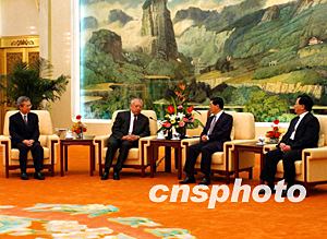 中國國家主席胡錦濤和副主席曾慶紅,七月十九日在北京人民大會堂會見香港特首董建華和行政長官辦公室主任林煥光。中新社記者:賈國榮