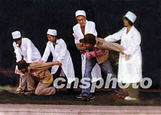 北京首都醫(yī)科大學(xué)的大學(xué)生們,近日在學(xué)校大禮堂舞臺演出活報(bào)劇《抗“非典”》。圖為身穿醫(yī)療防護(hù)裝的“醫(yī)護(hù)人員”將“非典病毒”捉拿歸案,以示正法。作者:首醫(yī)