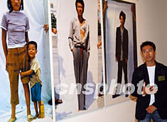 “香港藝術(shù)雙年展2003”,七月二十二日在香港藝術(shù)館舉行新聞發(fā)布會(huì),此次展覽共收到1500多件參賽作品,最后評(píng)選出十個(gè)優(yōu)秀獎(jiǎng)。圖為胡健一向賓客介紹他的攝影作品《游人》。中新社記者:錢(qián)興強(qiáng)