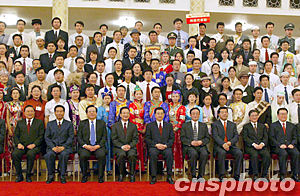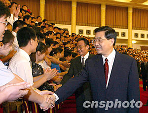 中共中央總書記胡錦濤等黨和國家領導人,二十二日在北京出席中國共青團第十五次全國代表大會開幕式,并在會前接見大會代表。中新社記者:滿會喬
