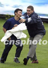 一名在昆明觀看西班牙皇家馬德里足球隊二十六日下午在的訓(xùn)練的狂熱球迷跳入場中,口中呼喊著勞爾的名字,希望得到簽名,被及時趕來的工作人員阻止。中新社記者:毛建軍