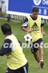 西班牙皇家馬德里足球隊二十六日下午在昆明冒雨訓(xùn)練,圖為勞爾在對抗訓(xùn)練中帶球過人。中新社記者:毛建軍