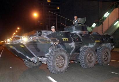 圖:菲律賓政府軍裝甲車(chē)圍住兵變士兵占領(lǐng)區(qū)