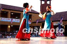 北加州華人運(yùn)動(dòng)會(huì)好時(shí)威之夜頒獎(jiǎng)晚會(huì)七月二十六日晚在美國圣荷西市舉行,生活在美西灣區(qū)的華裔演藝人士為頒獎(jiǎng)晚會(huì)獻(xiàn)上了精彩的演出。圖為中華演藝學(xué)院的學(xué)員表演蒙族舞《情思》。作者:陳鋼
