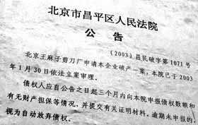 王麻子剪刀廠申請(qǐng)破產(chǎn)后,按照相關(guān)法律程序,法院在立案后,將有3個(gè)月的公告期,最終依法宣告破產(chǎn)。在破產(chǎn)清算后,用剩余資產(chǎn)安置職工、還貸、還債。宣告破產(chǎn)后,“王麻子”可以甩掉多大的經(jīng)濟(jì)包袱,廠方?jīng)]有明確的答復(fù),但他們認(rèn)為更重要的是多年來(lái)“剪不斷理還亂”的歷史問(wèn)題該有個(gè)說(shuō)法。(據(jù)《每日新報(bào)》)