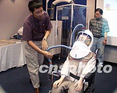 香港科技大學(xué)31日舉行流動呼吸感染控制裝置簡介會,該裝置適用于醫(yī)院病房及救護(hù)車,可以確保醫(yī)護(hù)人員在治療“非典”等傳染病病人時(shí),免受感染。圖為科大安全及環(huán)保處高級工程師俞宗岱博士(左)進(jìn)行現(xiàn)場示范。作者:謝育元