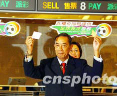 圖為馬會(huì)主席夏佳理在投注站購得第一張足球博彩票。