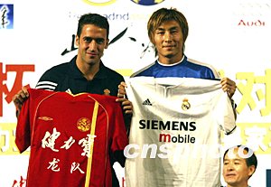 西班牙皇家馬德里足球隊與中國健力寶龍隊八月一日在北京飯店舉行賽前新聞發(fā)布會,皇馬隊長勞爾與龍隊隊長李瑋峰在會上互贈隊服。中新社記者:毛建軍