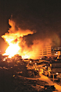 發(fā)生爆炸的石油氣倉庫位于澳門青洲河邊馬路巴士總站附近。事故發(fā)生現(xiàn)場,數(shù)小時內(nèi)烈焰黑煙沖天,爆炸聲不斷,火球應聲騰空。當局立即出動多部消防車滅火,大批警員也趕到,封鎖附近交通,并將周邊居民暫時疏散安置在社工局青洲災民中心。記者在現(xiàn)場看到,澳門運輸工務司司長歐文龍、警察總局局長白英偉等官員也趕到現(xiàn)場指揮滅火。