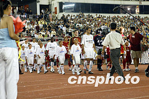西班牙皇家馬德里足球隊與中國健力寶龍隊的比賽八月二日晚在北京工人體育場舉行。中新社記者:毛建軍