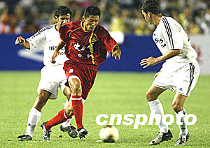 西班牙皇家馬德里足球隊與中國健力寶龍隊的比賽八月二日晚在北京工人體育場舉行。圖為羅納爾多被中國龍隊隊員前后夾擊防守。中新社記者:毛建軍