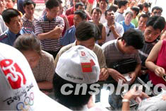 八月四日是2008北京奧運會徽揭曉后的第一天,大批市民一大早擁向北京百貨大樓搶購T恤衫、球帽等會徽紀(jì)念產(chǎn)品。中新社記者:張煒