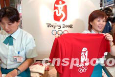 八月四日是2008北京奧運會徽揭曉后的第一天,會徽紀(jì)念產(chǎn)品開始在北京定點商場限量發(fā)售。北京百貨大樓的營業(yè)員正在向顧客展示紀(jì)念T恤衫,最便宜的T恤衫每件賣108元人民幣。中新社記者:張煒
