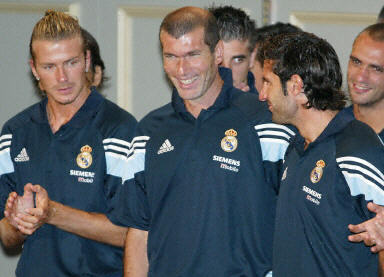 當(dāng)?shù)貢r間8月4日上午,日本方面為皇馬舉行了隆重的歡迎儀式,圖為貝克漢姆和齊達內(nèi)等在發(fā)布會上。