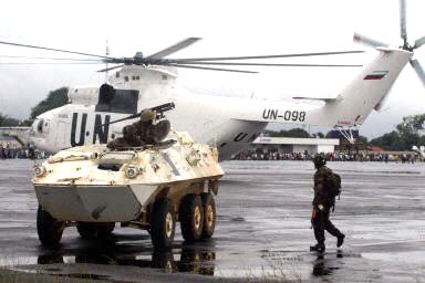 在瓢潑的大雨中,大約300名尼日利亞士兵乘坐兩架聯(lián)合國的直升機出現(xiàn)在離首都蒙羅維亞45公里的羅伯茨菲爾德機場。他們手握沖鋒槍,確保機場安全。