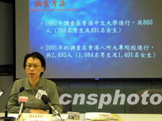 香港中文大學(xué)五日公布的調(diào)查結(jié)果顯示,與92年時相比,香港大專學(xué)生對性騷擾問題的意識仍然不高。圖為負(fù)責(zé)這項研究工作的香港中文大學(xué)心理學(xué)系教授鄧素琴。作者:裘之越