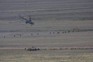 聯(lián)合指揮部迅速作出應(yīng)對(duì)之策,指揮參演國(guó)武裝力量,在空中武裝直升機(jī)、特種空降部隊(duì)和地面裝甲、火炮、特種作戰(zhàn)等部隊(duì)的空地密切配合下,對(duì)非法越界的武裝分子展開(kāi)了猛烈的攻勢(shì)。