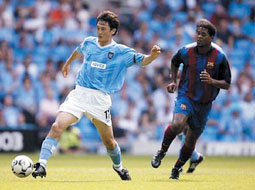 這是曼城備戰(zhàn)新賽季英超的最后一場比賽,同時(shí)也是曼徹斯特大球場的揭幕戰(zhàn),因此,主教練基岡格外重視。孫繼海首發(fā)出場擔(dān)任右后衛(wèi),他的身后是門將西曼。而他面對的是剛剛轉(zhuǎn)會巴塞羅那隊(duì)的小羅納爾多的進(jìn)攻。第5分鐘,奧維馬斯帶球突破菲利普斯后獲得很好的機(jī)會,孫繼海上前封堵,逼得奧維馬斯傳球出界。雖然對手實(shí)力很強(qiáng),但在主場作戰(zhàn)的曼城仍與對手展開對攻。孫繼海與菲利普斯這邊的進(jìn)攻明顯要比左路活躍。第34分鐘曼城首先打破僵局,貝爾科維奇中路得球后轉(zhuǎn)身快速突破,雷茨格爾慌亂中將球誤傳給阿內(nèi)爾卡,法國人門前右腳推射破門。上半場曼城一球領(lǐng)先巴塞羅那。