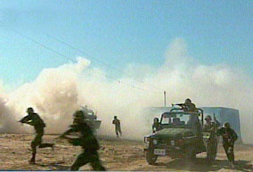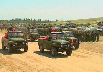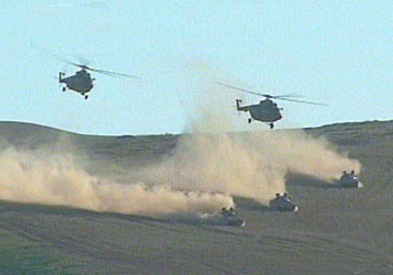 在攻打恐怖分子營地、圍殲恐怖分子的實(shí)兵實(shí)彈演習(xí)中,參演的聯(lián)合部隊(duì)800多人對邊境地區(qū)的恐怖分子營地展開了強(qiáng)大的攻勢?罩兄鄙龣C(jī)盤旋攻擊,地面坦克、裝甲車和步兵從左、中、右三路對恐怖分子實(shí)施圍剿,遠(yuǎn)方炮兵強(qiáng)大的火力摧毀恐怖分子營地內(nèi)的堡壘,壓制著恐怖分子的火力,不時(shí)有導(dǎo)彈呼嘯而過,準(zhǔn)確地?fù)糁锌植婪肿拥闹笓]地點(diǎn)。特種反恐分隊(duì)在模擬國境線上空降,截?cái)嗫植婪肿拥脑骄程右葜贰?/p>