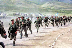 8月7日,哈薩克斯坦烏恰拉爾某空軍基地。平靜的晴空中,傳來飛機的轟鳴,兩架蘇—27戰(zhàn)斗機,緊緊擠壓著一架安—26型客機,向機場跑道滑落,驚險緊張的反劫機演習(xí)正在進行。同一天,五國部隊還進行了“解救人質(zhì)”演習(xí)。