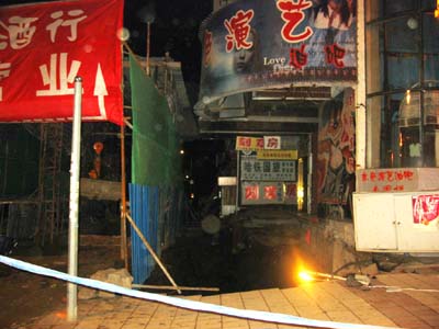 新華網(wǎng)的消息則引述地下工程事故現(xiàn)場(chǎng)目擊者介紹,他們當(dāng)時(shí)只聽(tīng)到轟隆一聲,隨后看到位于花園街和奮斗路交口處的本色演藝迪吧門前塌陷出一個(gè)50平方米左右的大坑,幾名路人隨即掉了下去。