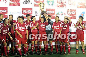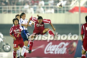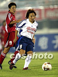 2003中國女足南北明星爭霸賽八月十七日晚在北京先農(nóng)壇體育場進行,經(jīng)過八十分鐘的全場較量,最終北方隊?wèi){借韓端的帽子戲法最終以4:1戰(zhàn)勝南方隊獲得本屆中國女足南北明星爭霸賽的冠軍。中新社記者:盛佳鵬