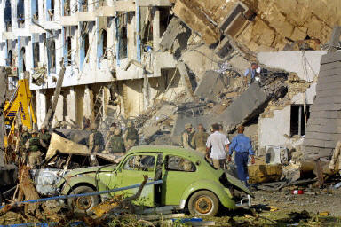 聯(lián)合國雇員告訴?怂剐侣,爆炸發(fā)生時大樓里至少還有150名工作人員。?怂剐侣動浾叩-斯普林杰自現(xiàn)場發(fā)回的報道稱,兩層高的“運河賓館”有整整一個角被炸掉!據(jù)稱,爆炸的中心位置好象位于賓館的大廳。(章田)