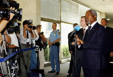 由于聯(lián)合國駐伊拉克辦事處19日遭汽車炸彈襲擊,安南決定立即中止在芬蘭的休假返回聯(lián)合國總部。他在斯德哥爾摩作短暫停留時(shí)舉行的記者招待會(huì)上說,無論是對聯(lián)合國,還是對伊拉克或整個(gè)國際社會(huì),這都是一個(gè)“黑色的星期二”,“但我們將繼續(xù)我們的工作,至少我們有責(zé)任不能讓在炸彈襲擊事件中死亡的人白白地犧牲”。