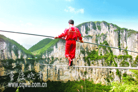 中新網(wǎng)重慶8月22日電(王小毅 姜道策)今天,“高空王子”阿迪力走鋼絲穿過了有“天下第一坑”之稱的奉節(jié)天坑,創(chuàng)造了走鋼絲離地面絕對(duì)高度六百六十二米的新世界紀(jì)錄。