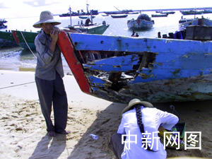 中新社?诎嗽露针(記者關(guān)向東王辛莉通訊員余茂生)?谛潞4鍧O民陳家位,一臉疲憊地依在剛打撈出水的自家漁船船頭,船頭左側(cè)一大洞,后艙甲板翻倒在沙灘上,兩年前花七萬元人民幣造的漁船因一場臺(tái)風(fēng)轉(zhuǎn)眼間散架成一堆廢木。