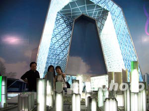 一進展廳,只見趙忠祥、李瑞英、羅京笑瞇瞇地坐在臺前,馬上把觀眾帶入《新聞聯(lián)播》的氛圍中。這是第一個展區(qū):走近央視,包括央視臺標簡介、十三個頻道簡介及屏幕的實時播出畫面、大型電視墻等,著名主持人、記者和編導也將在此與觀眾面對面交流。另有互動平臺、經典薈萃、走向世界、數(shù)字浪潮、未來時空等一共十個展區(qū),回顧了中國中央電視臺四十五年發(fā)展史,并展示了新臺址工程。