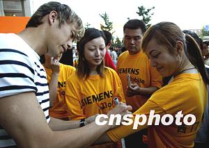 西門子移動(dòng)電話公司三十日為中國(guó)女子足球隊(duì)9月出征世界杯比賽舉行“萬(wàn)人簽名為中國(guó)女足加油”活動(dòng)。中國(guó)男足隊(duì)員祁宏為“西門子小姐”邀簽名留念。中新社記者:趙振清