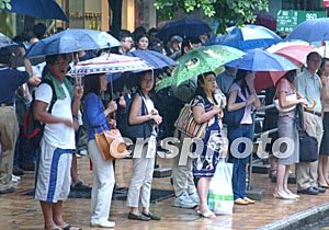 受臺風影響,香港二日下午交通堵塞,許多乘客在雨中耐心等待乘車。中新社記者:錢興強