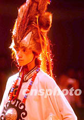 四川省風(fēng)景名勝九寨溝的民族藝術(shù)團(tuán),在夏秋旅游旺季的晚會上展示昔日羌族寨主的服飾風(fēng)采。中新社記者:賈國榮
