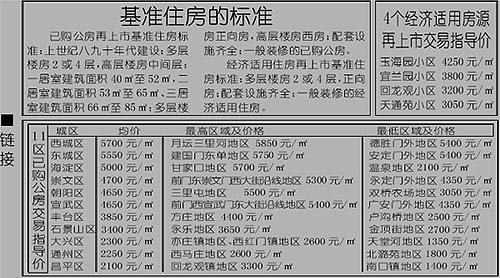 中新網(wǎng)9月5日電 北京市國土房管局昨天首次公布已購公房和經(jīng)濟適用房再上市的交易指導價格。