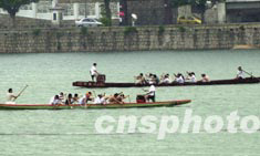 “2003年澳門亞太城市龍舟邀請賽”開鑼在即,六日已有部分參賽隊伍在南灣湖冒雨練兵。中新社記者:李剛
