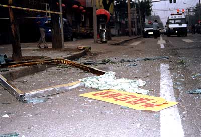據(jù)北京娛樂信報(bào)報(bào)道,肉餅店臨街的一扇門和三個窗戶全部被炸碎,馬路中間全是炸飛的碎玻璃,并有門窗框被炸飛到馬路對面。酒吧和肉餅店的所有窗戶都被炸壞。