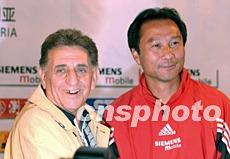 九月八日下午,即將參加十日舉行的雅典奧運(yùn)會(huì)足球預(yù)選賽的中國(guó)U23隊(duì)(國(guó)奧隊(duì))主教練沈祥福(右)和敘利亞隊(duì)主教練沙馬斯(左)在昆明舉行聯(lián)合記者會(huì)。中新社記者:張煒