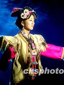 四川省九寨溝民族藝術(shù)團如今每天為當?shù)刂型庥慰团e行篝火晚會,羌族姑娘展示昔日游牧生活的服飾,漂亮而實用。中新社記者:賈國榮