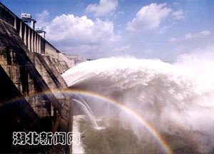 中新湖北網(wǎng)9月9日電 漢江第二次洪峰于八日凌晨一點(diǎn)到達(dá)丹江口水庫,最大洪峰流量達(dá)二萬八千五百立方米每秒,大約在今天下午五點(diǎn)丹江口水庫水位將達(dá)到一百五十六點(diǎn)七米,為一九八四年來最高水位。為緩解對水庫壓力,丹江口水庫開閘向下游泄洪。劉鐵軍 攝