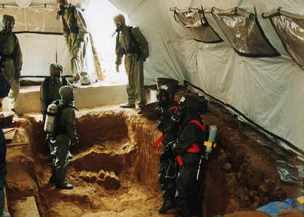 防化———挖掘現(xiàn)場搭建負(fù)壓通風(fēng)帳篷,一旦毒彈發(fā)生泄露,毒氣不易外泄。此次回收與以往最大不同在于,挖掘點(diǎn)使用的防毒面具是隔絕式的貯氣面具,所供氧氣為專供,以防止高濃度光氣對面具的穿透和芥子氣毒劑對人體的傷害。場區(qū)多點(diǎn)進(jìn)行不間斷的空氣樣品毒劑檢測分析,及時(shí)發(fā)現(xiàn)毒劑泄露。