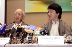 香港貿(mào)易發(fā)展局9月18日在香港舉行《香港國際影視展2003》記者會(huì),嘉禾娛樂事業(yè)主席兼貿(mào)發(fā)局影視娛樂業(yè)咨詢委員會(huì)主席鄒文懷(左)、「香港電影大使」成龍分別于會(huì)上發(fā)言。作者:鄧慶樂