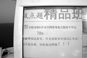 據(jù)《京華時(shí)報(bào)》報(bào)道,北京某高校剛剛參加完英語四級(jí)考試的小鮑反映,前天,不少同學(xué)在地質(zhì)大學(xué)看到當(dāng)晚在該校將舉行“四級(jí)考試考前點(diǎn)題培訓(xùn)”的海報(bào),入場(chǎng)券50元,舉辦方為北京宇航考試培訓(xùn)學(xué)校。“這次培訓(xùn)點(diǎn)中了試題中大概50分的內(nèi)容!”