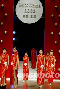 選手們身穿旗袍裝通過(guò)紅色宮門向世人演繹中國(guó)女性的美麗風(fēng)韻。中新社記者:毛建軍