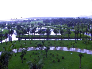 事實上,當(dāng)記者站在酒店總統(tǒng)套房的大露臺上,心曠神怡的感覺真是撲面而來。在這個露臺上俯瞰酒店的生態(tài)泳池,綠色的島嶼小品與棕色木質(zhì)燒烤回廊講述著回歸自然的故事;視野穿過起伏的高爾夫球場,可以遠(yuǎn)眺南中國海的碧波。一條被河流沖積泥沙與外海海浪共同作用而成的沙堤——玉帶灘,蜿蜒三公里將萬泉河、龍滾河、九曲江三江入海口分成了內(nèi)外咸淡兩海,其中內(nèi)海之中形成若干個小島,在眼前演繹著豐富而多變的江、河、湖、海、島嶼、山脈的水域景觀。