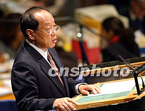 中國外長李肇星九月二十四日在第五十八屆聯(lián)大一般性辯論中發(fā)言時(shí)表示,為了維護(hù)世界和平,促進(jìn)共同發(fā)展,應(yīng)該加強(qiáng)國際合作,走多邊主義道路,促進(jìn)世界多極化。中新社記者:趙海燕
