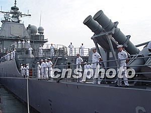 美國(guó)艦艇編隊(duì)于九月二十六日上午結(jié)束對(duì)中國(guó)南海艦隊(duì)的訪問離開湛江港。圖為美國(guó)導(dǎo)彈巡洋艦“考彭斯”號(hào)上的美軍在甲板上。作者:李小軍