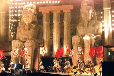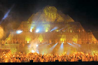 夜色中,雄偉的埃及金字塔在絢麗的燈光映襯下顯得格外迷人。歡呼的人群,凱旋的勇士,齊放的禮花,昨晚工體數(shù)萬觀眾在這里領(lǐng)略了世界上最大場面的演出。